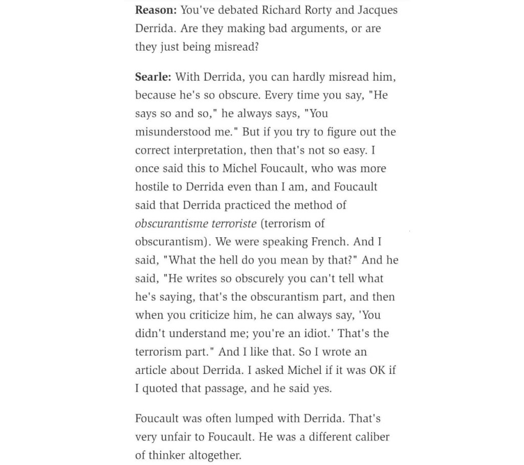 Not just Derrida: it was the house style of French post-structuralism – Lacan, Althusser, the whole crowd. Which was then copied to America and became the house style for a whole generation of postmodern academics – most notably, perhaps, Judith Butler.