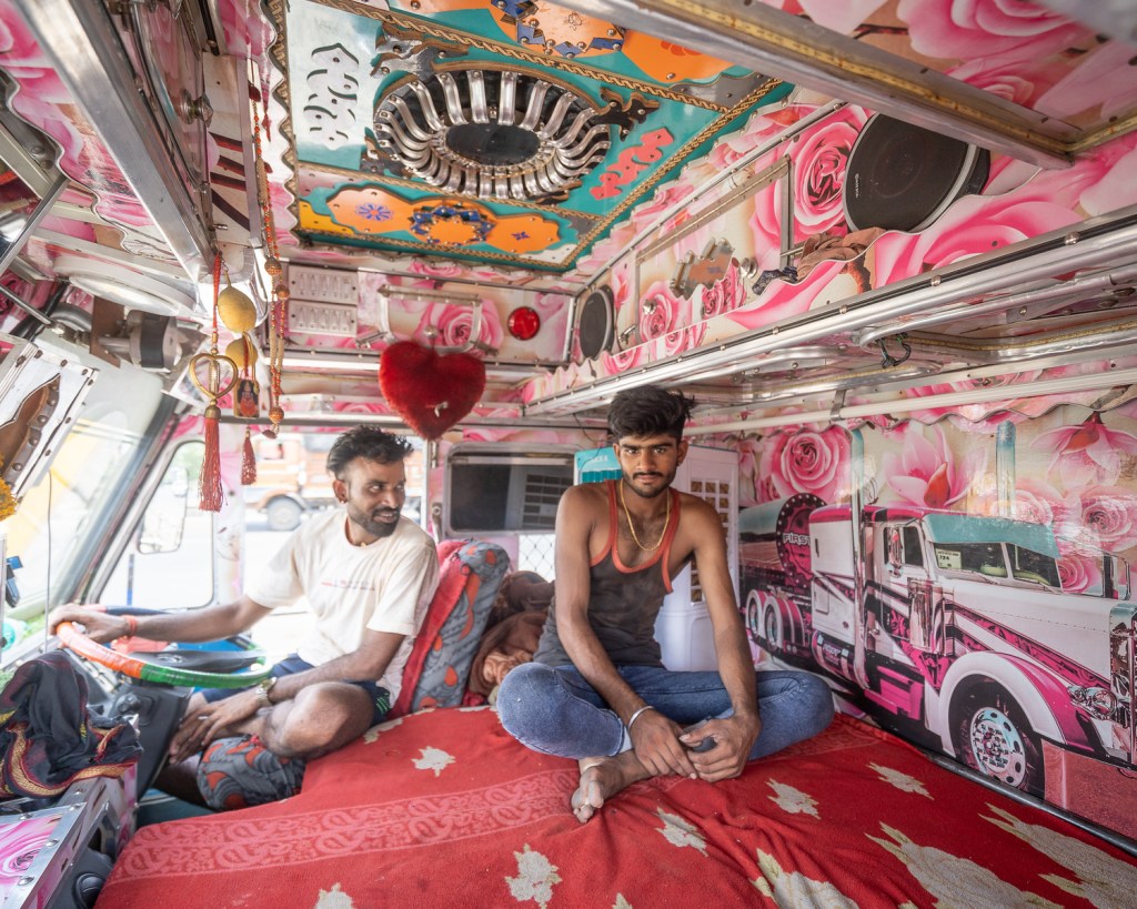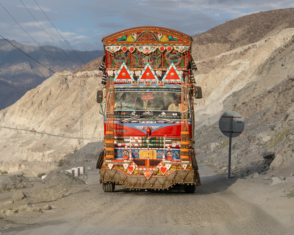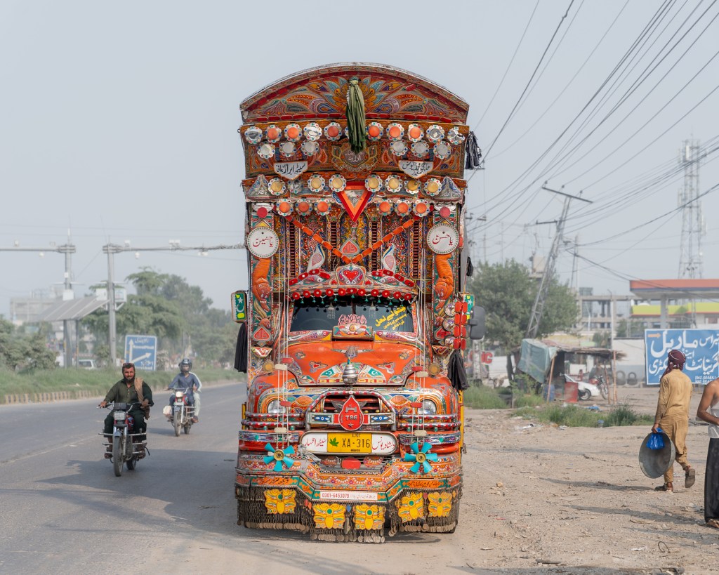 The designs reflect a driver’s identity, faith and aspirations and span a bewildering range of themes: ideals of masculinity might be intertwined with expressions of love and longing, while bold typography urges drivers to blow their horns or promotes a campaign for the education of girls.
