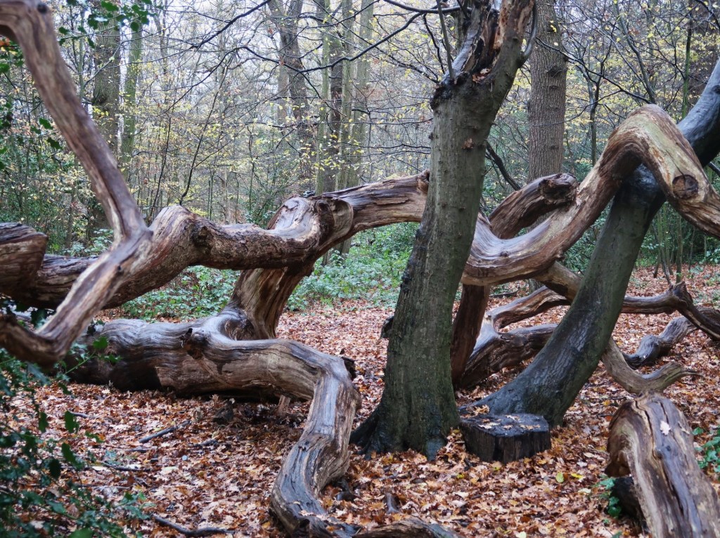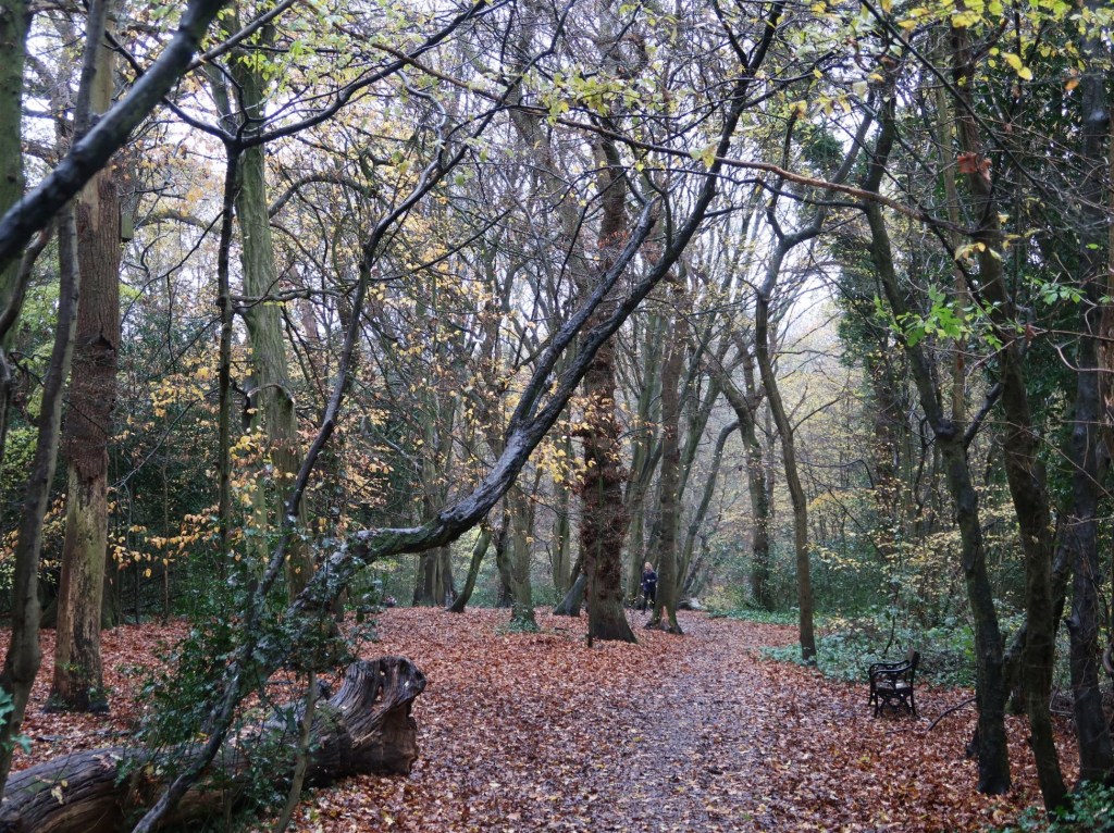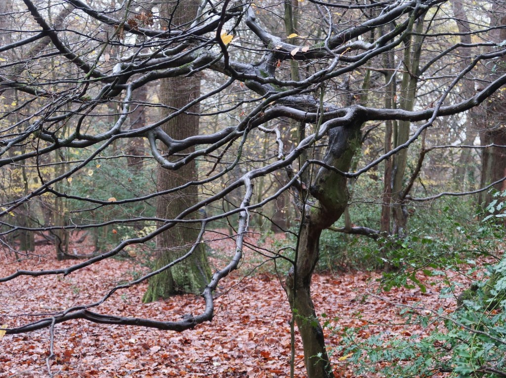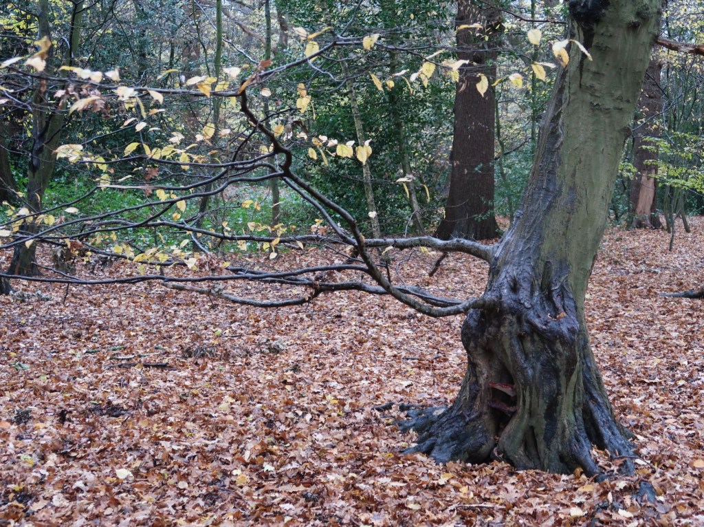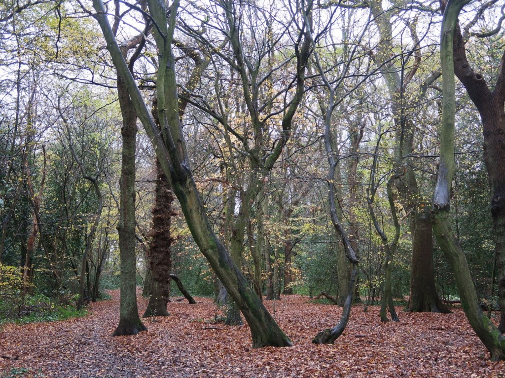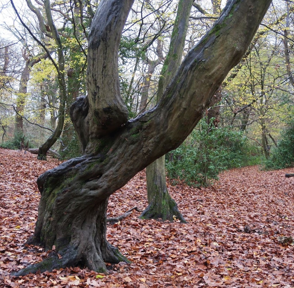 A drizzly walk through Queen’s Wood and Highgate Wood this morning – some views, some gnarly hornbeams: