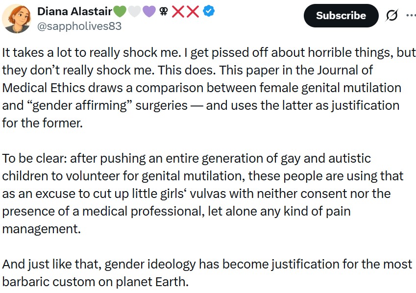 “The article blames western media for causing harm by wanting to tackle [FGM]. Nowhere does it mention that this is intended to reduce pleasure and maintain patriarchal control. Publishing this, academia is really digging its own grave.”
