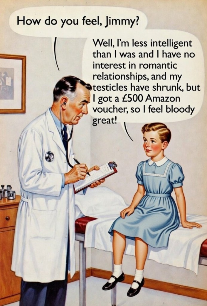 Further to this – vouchers for children who consent to having their puberty blocked and their lives ruined in the name of medical progress.